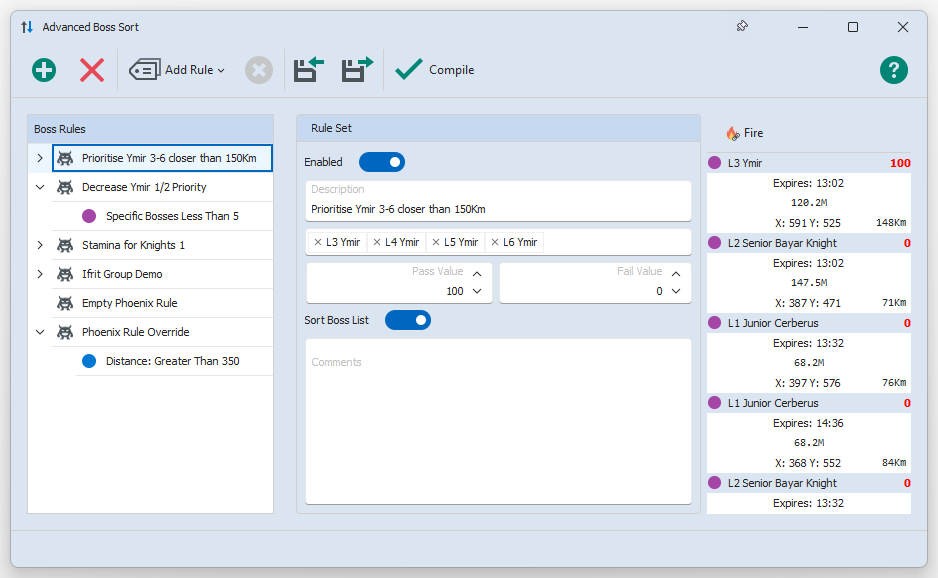 Please note that these rules are run every time the cache updates and every time a boss is added or taken. If you run too many rules, you may notice performance drop in the user interface.