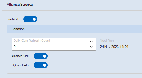 Quick Help will press the Help button on the way to the Alliance Science page if there are alliance members requesting help.