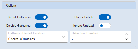 Gathering Restart Duration is how long to wait before re-enabling gathering. Leave this at 0 to leave it disabled permanently.