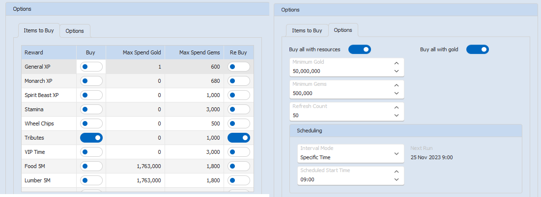 Note that XP and stamina can cost differing amounts based on how many are for sale. If you want to buy the "multi-packs" ensure you set your gem/gold maximum spend value high enough.