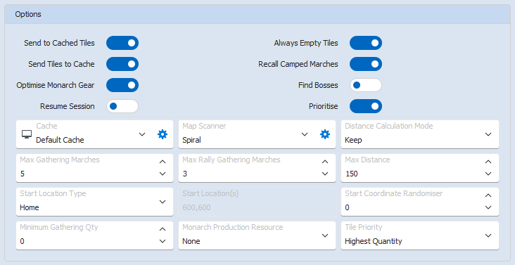 Sometimes when sending to a tile, the tile can vanish whilst you are still marching to it leaving your march in a camp where the tile used to be (potentially wasting the march until you notice it). With this option enabled, camped marches will be automatically recalled upon detection. Note that this setting will be in effect even if the gathering routine is not enabled,