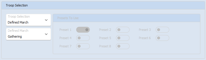 Cycle through presets. Each preset will be used in turn. You may wish to do this if you prefer to send your lower tiers to gather quickly. Of course by doing this, you cannot send only what is required and also cannot guarantee that what you send will completely empty the tile.