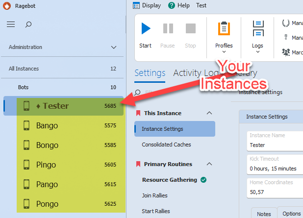 Each instance can be named. For best results, name your instance then same in Ragebot as the corresponding instance in Bluestacks.