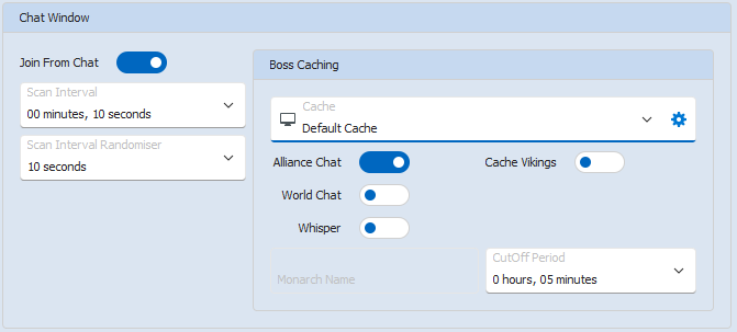 Whilst joining rallies, you can also cache bosses that are found in the chat window(s) You can scan any of Alliance Chat, World Chat or Whisper. The bosses that you want to be cached are taken from the Boss Finder routine but the Boss Finder routine does not need to be enabled.in order to cache bosses found in chat.