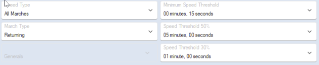 If the remaining march time is less than Threshold50 and greater than Threshold30, a Speed50 is used. If the same condition is still true, another is used and this repeats until the march time is less than Threshold30.