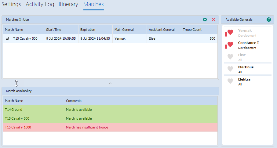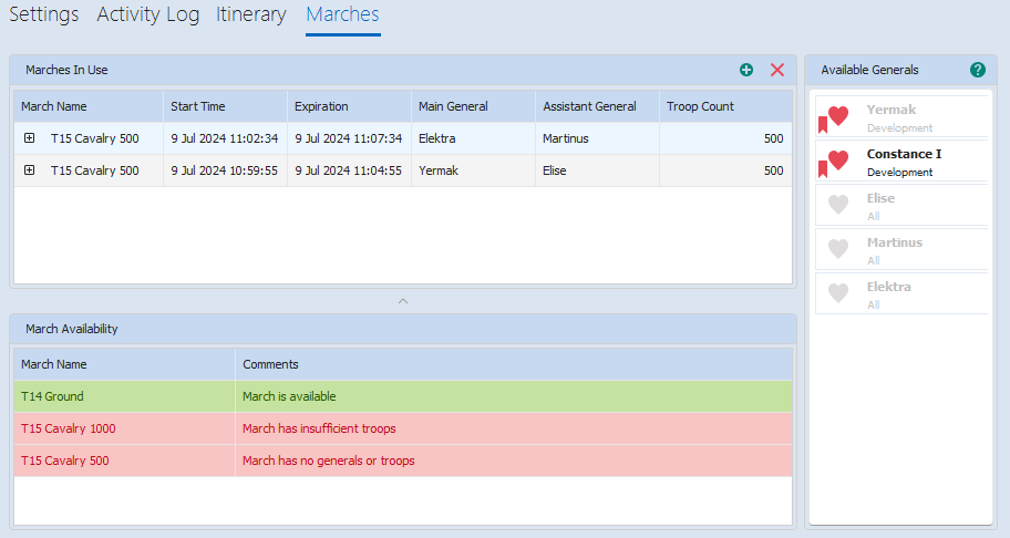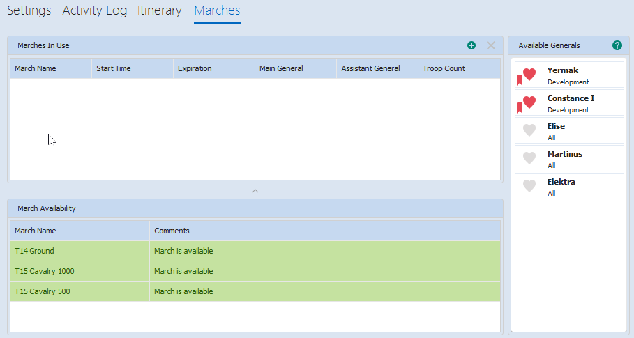 You can add marches to the cache manually and determine if other marches are affected as a result. For example, if two marches use the same general, both marches are unavailable once either march is is use.