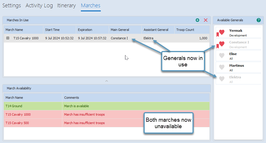Adding another copy of the 500 march results in both T15 marches now being unavailable as all troops are now in use.