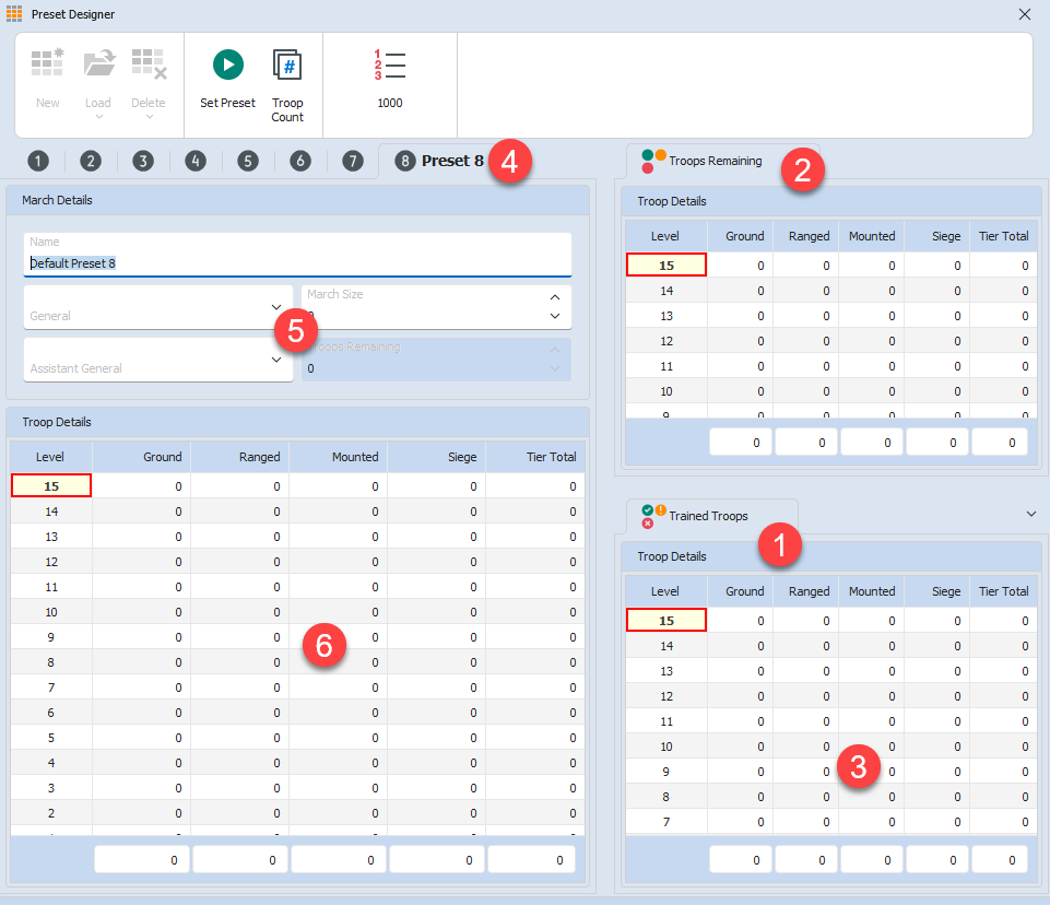 Enter the number of troops of each tier into the Troop Input Area (6). If you switch to the "Remaining Troops" tab, each time you input troops into a preset, you will notice the corresponding Troop Count in "Available Troops" decrease. If you use more troops in your presets than you actually have, you will see the boxes turn red.
