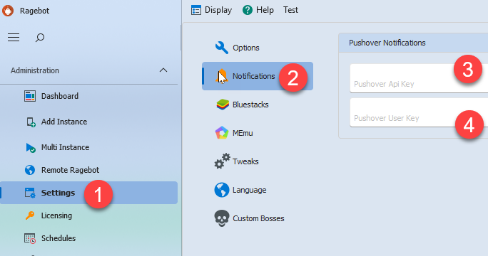 3. Input the API Key from the newly created application and the User Key for your Pushover profile settings into Ragebot on the "Application Settings" page.