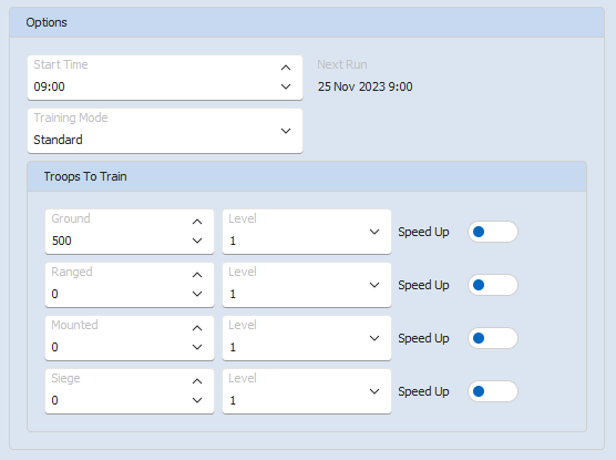 The above image in Batch mode would train a full set of troops 500 times and speed them up each time.